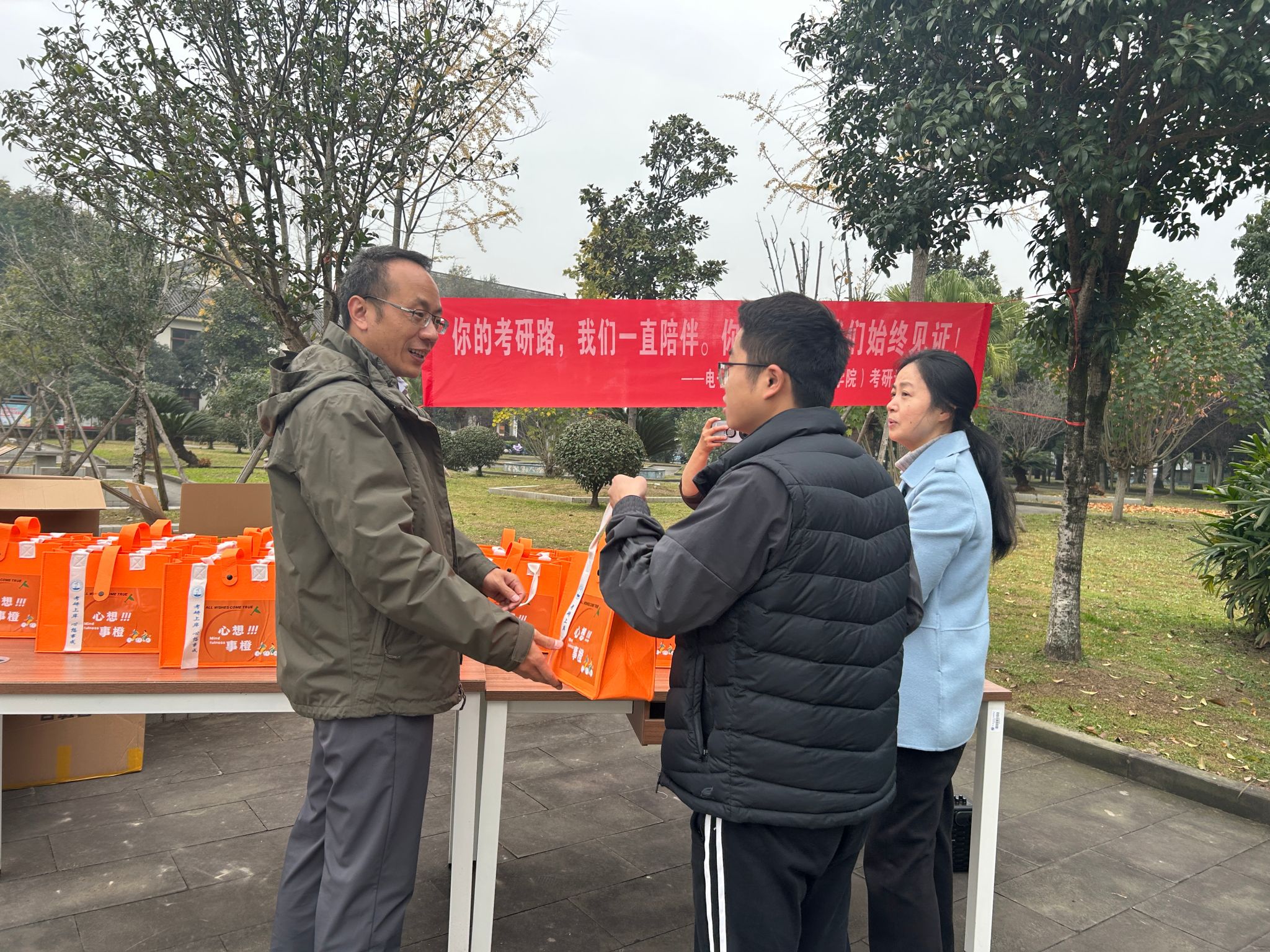公司精心定制了“心想事橙”礼物包、考研专属加油牌、复习温暖“两件套”。希望通过慰问礼物来传递学院对考研同学的关心与鼓励,激励同学们以更加饱满的热情投入最后的复习阶段,为同学们加油打气,自信地走进考场。
