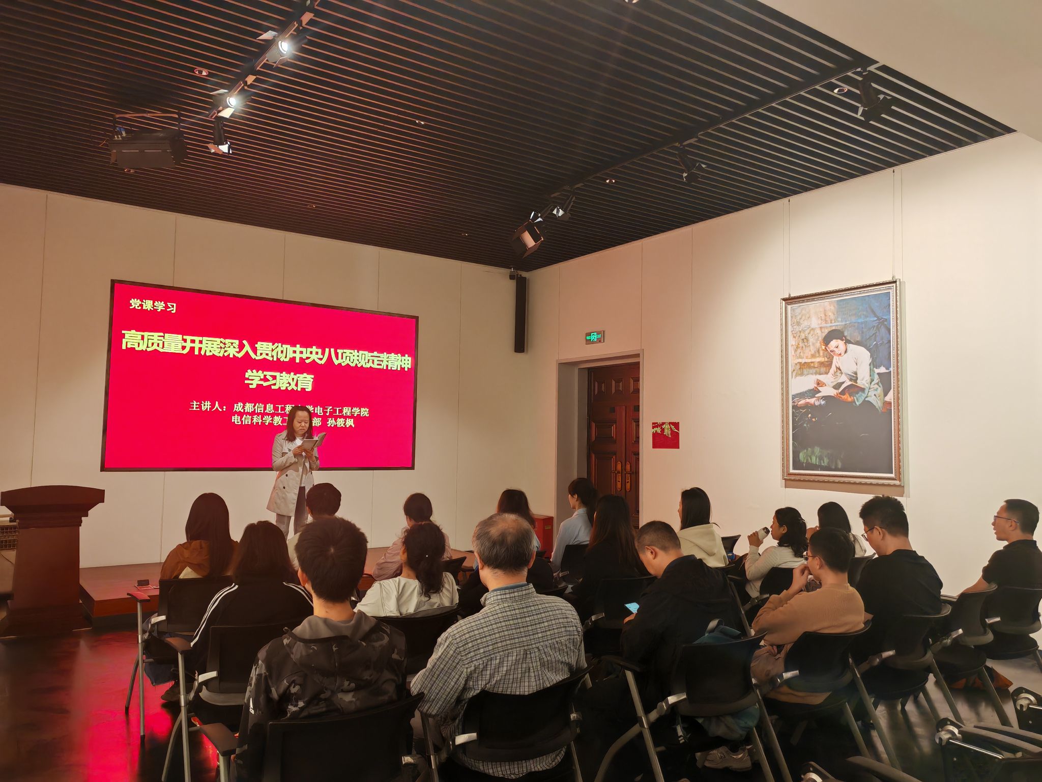 参观完纪念馆后,电信科学教工党支部书记孙筱枫带领同志们开展了一次严肃认真的专题学习会。孙筱枫以“深化作风建设,永葆政治本色”为主题,围绕政治纪律、廉洁自律、务实作风三个维度贯彻落实中央八项规定精神,带领全体教工党员进行了深入系统的理论学习。