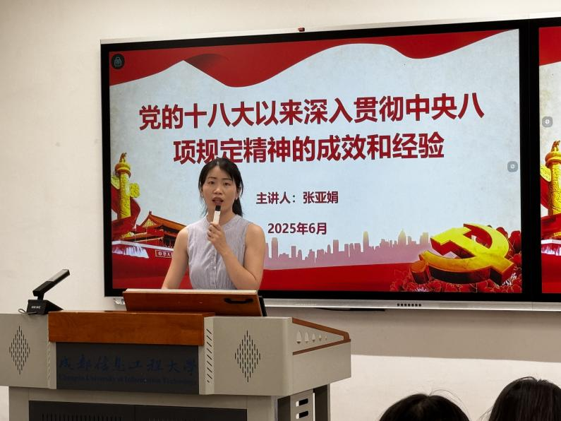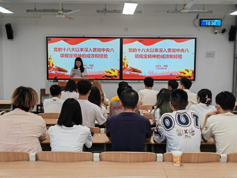 熊瑶通过典型案例分析,深入剖析了“四风”问题的表现形式和危害,同时强调,青年党员要始终牢记“作风建设永远在路上”,从规范学术行为、简化活动形式、厉行勤俭节约等具体事项做起,将中央八项规定精神内化于心、外化于行。