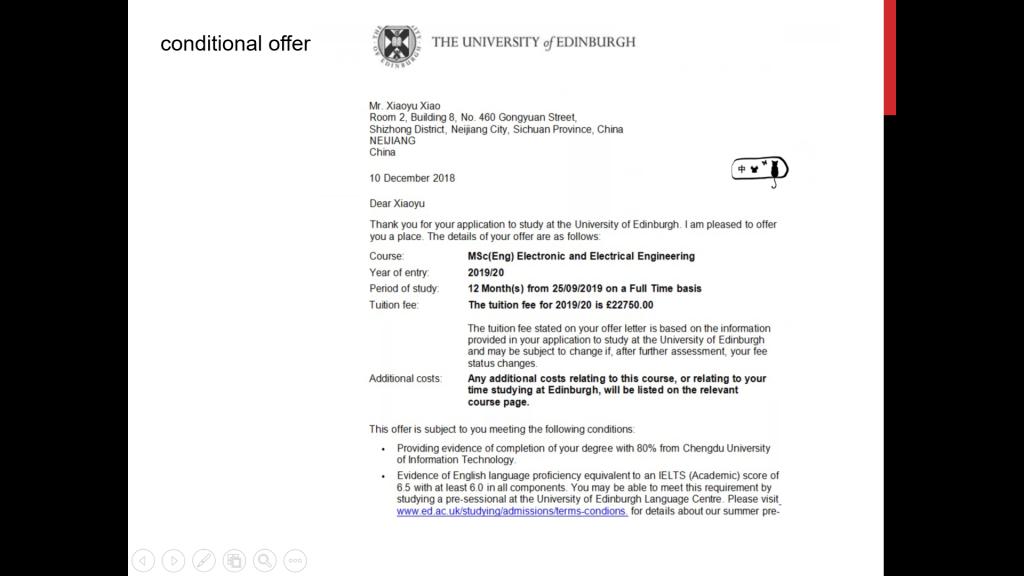 肖啸宇学长一共拿到了来自爱丁堡大学、曼彻斯特大学、华威大学、利兹大学的五个offer。在分享过程中,学长介绍了自己的成绩,如何准备出国,需要准备哪些材料以及假期如何做,怎样充实自己的简历。也向大家分享了考试和准备的技巧,其中提到英语口语和写作是较难的项目,需要大家加强重视。交流过程中,学长以精妙的语言将自己的经验毫无保留地分享给大家,同学们纷纷在QQ群中提出自己的问题,学长也非常热心的回答大家。会议最后,肖啸宇学长鼓励大家一定要坚持到底,虽然是线上交流,但同学们的热情也十分高涨。